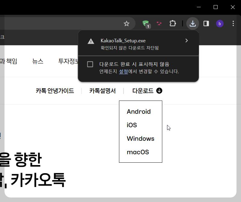 사용하시는 웹브라우저의 보안설정에 따라서 위와 같이 설치파일의 다운로드가 차단되는 경우도 있습니다.