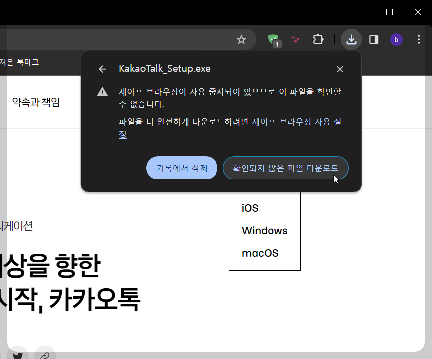 "확인되지 않은 파일 다운로드"를 클릭해서 설치파일의 다운로드를 계속 진행합니다.
